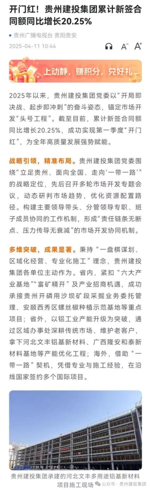 近日,贵州建投集团一季度迎来“开门红”,引发多家媒体聚焦报道。截至目前,集团累计新签合同额同比增长20.25%。省内市场,已成功承接多个重点项目;省外市场,以铝工业产能升级为发力点,斩获系列产能优化工程;海外市场,依托专业与产业链优势,在“一带一路”沿线国家签约多个国际项目。