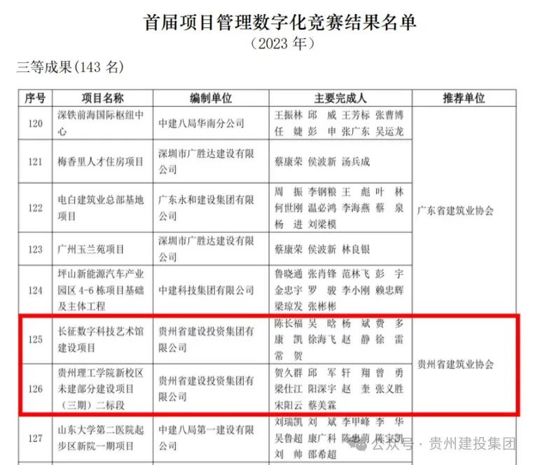 近日,从中国建筑业协会传来好消息:由贵州省建筑业协会推荐、贵州建投集团编制完成的“长征数字科技艺术馆建设项目”和“贵州理工学院新校区未建部分建设项目(三期)二标段”2项BIM成果,荣获国内首届项目管理数字化竞赛三等成果奖。