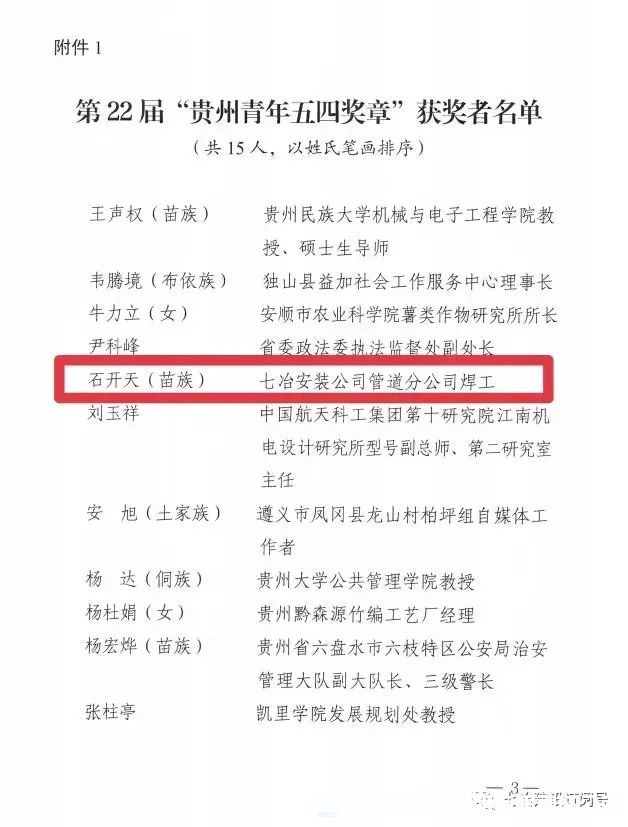 - 七冶安装公司青年职工石开天荣获第22届“贵州青年五四奖章”