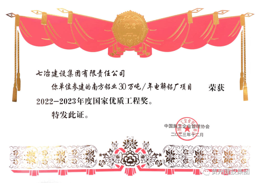 2023年12月24日,贵州建投集团(原七冶建设集团)参建的南方铝业30万吨/年电解铝厂项目荣获2022~2023年度国家优质工程奖。