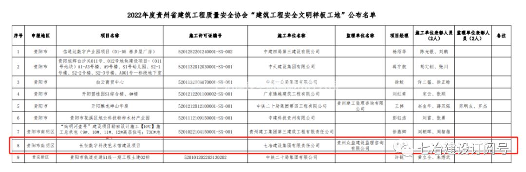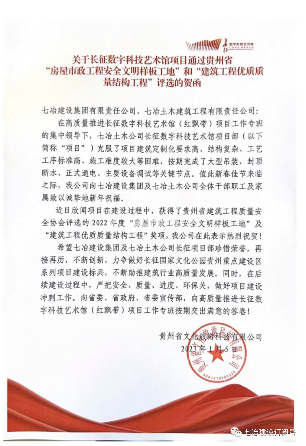 - 喜报!七冶长征数字科技艺术馆项目获评贵州省“房屋市政工程安全文明样板工地”和“建筑工程优质质量结构工程”