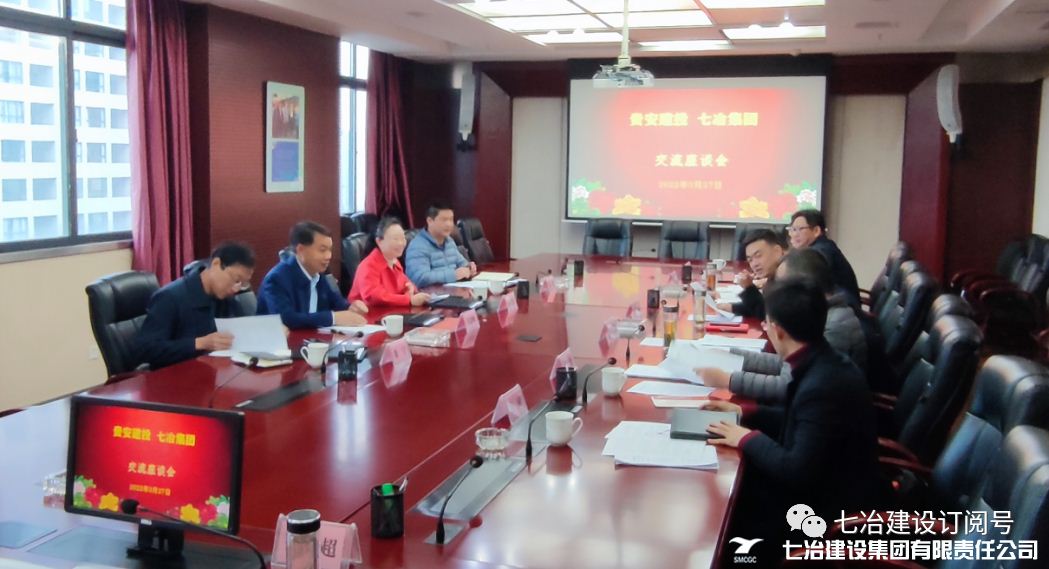3月27日上午,贵安建投公司总经理刘晓星、副总经理焦凌峰一行莅临七冶建设集团,就目前合作共建的项目推进情况开展交流座谈。七冶建设集团党委书记、董事长潘海,总工程师汪洋及相关部门、贵安公司负责同志参加座谈。