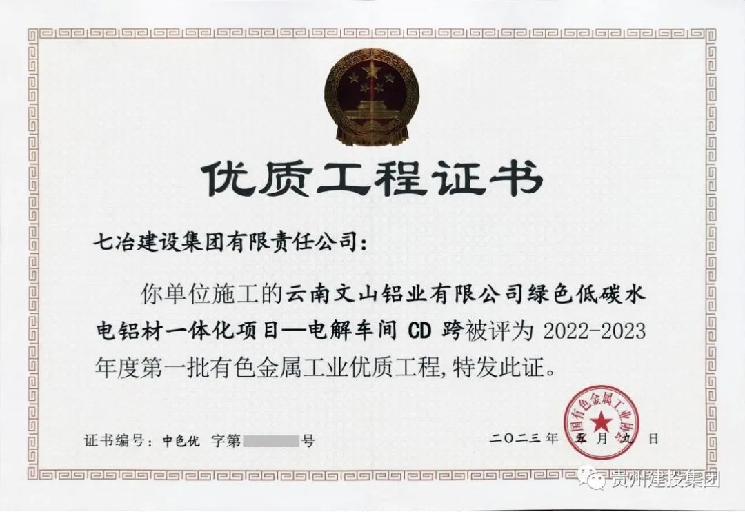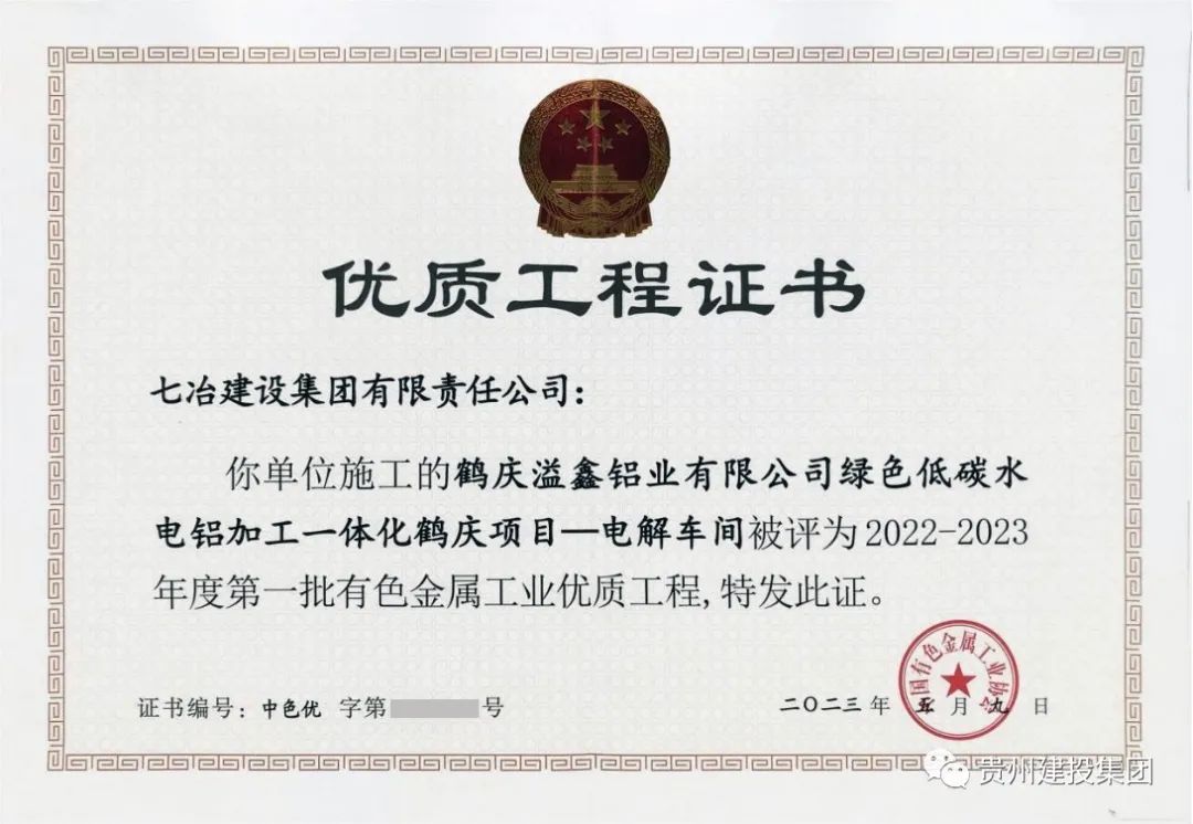 近日,中国有色金属工业协会颁布了2022-2023年度第一批中国有色金属工业(部级)优质工程获奖名单。贵州建投集团(原七冶建设集团)承建的“鹤庆溢鑫铝业有限公司绿色低碳水电铝加工一体化鹤庆项目—电解车间”和“云南文山铝业有限公司绿色低碳水电铝材一体化项目—电解车间CD跨”两项工程获评部优工程。