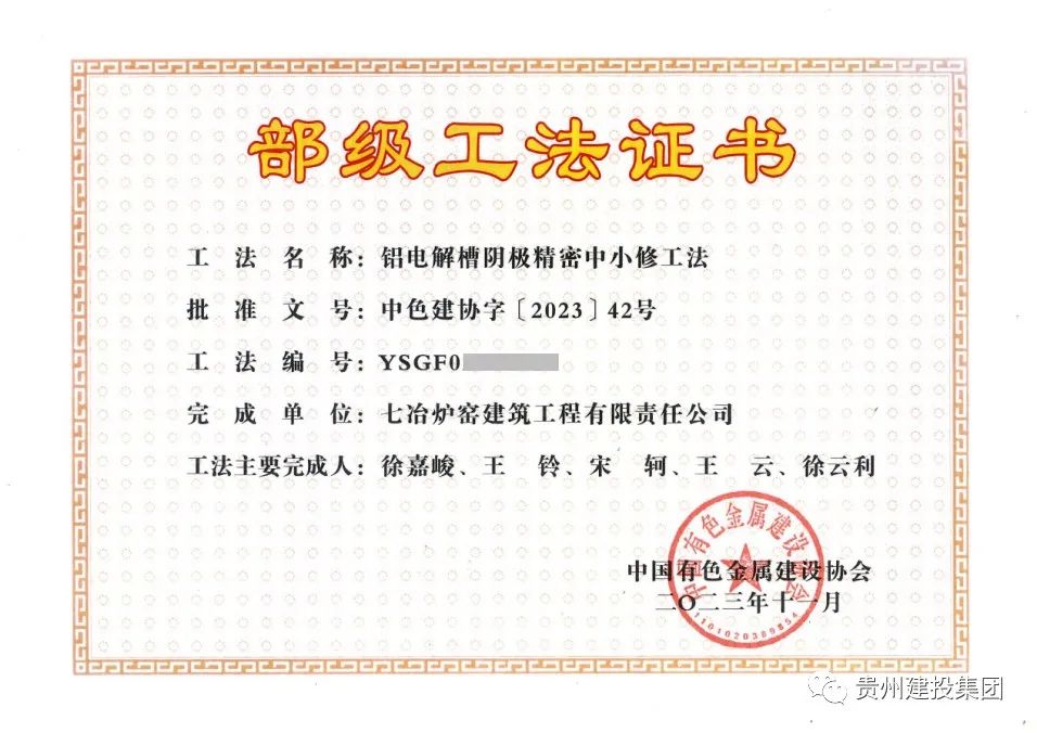 此外,在中国有色金属建设协会公布的2023年度部级施工工法名单中,贵州建投集团下属七冶炉窑公司完成的《铝电解槽侧部在线修补工法》和《铝电解槽阴极精密中小修工法》榜上有名。为技术创新再添新成果的同时,标志着集团在施工质量、技术革新、项目管理等方面实现新突破。